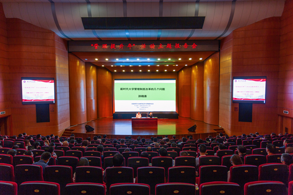 为进一步强化干部职工思想和形势教育,充分认识管理提升对学校发展的迫切性。5月31日,学校举办了“管理提升年”活动第二场报告会。沈阳师范大学特聘教授、博士生导师、教育经济与管理研究所所长孙绵涛教授在会上作“新时代大学管理制度改革的几个问题”的主题报告。校领导班子成员,全体中层干部及科级干部,民主党派、知联会负责人,二级学院系主任等近300人一起聆听了报告。报告会由校党委书记刘剑虹主持。