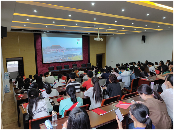 大会在在北京天安门广场隆重举行,中共中央总书记、国家主席、中央军委主席习近平发表重要讲话,师生认真聆听了习近平总书记的重要讲话,更加深切地领会了新中国成立70周年来的风雨兼程和翻天覆地的变化。随后,阅兵式正式开始,各种方阵整齐划一的步伐、昂扬抖擞的精神面貌引起了在座师生不断地惊呼。