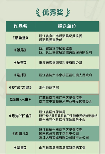 6月11日,由中国纪检监察杂志社、浙江省纪委省监委等部门联合主办的第六届“玉琮杯”清廉微电影微视频大赛颁奖活动在杭州举行。我校原创廉洁微电影《抄“欲”之键》与浙江师范大学、广西大学、浙江传媒学院等高校从全国2400余部参赛作品中脱颖而出,获得大赛微视频类优秀奖。